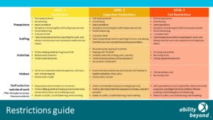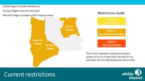 We remain vigilant in monitoring COVID in our regions, and as always we’re taking every precaution to keep our individuals safe. The below diagram shows the areas we serve as well as state provided restrictions. As you can see everyone in our homes, as well as visiting, are asked to follow these guidelines:
