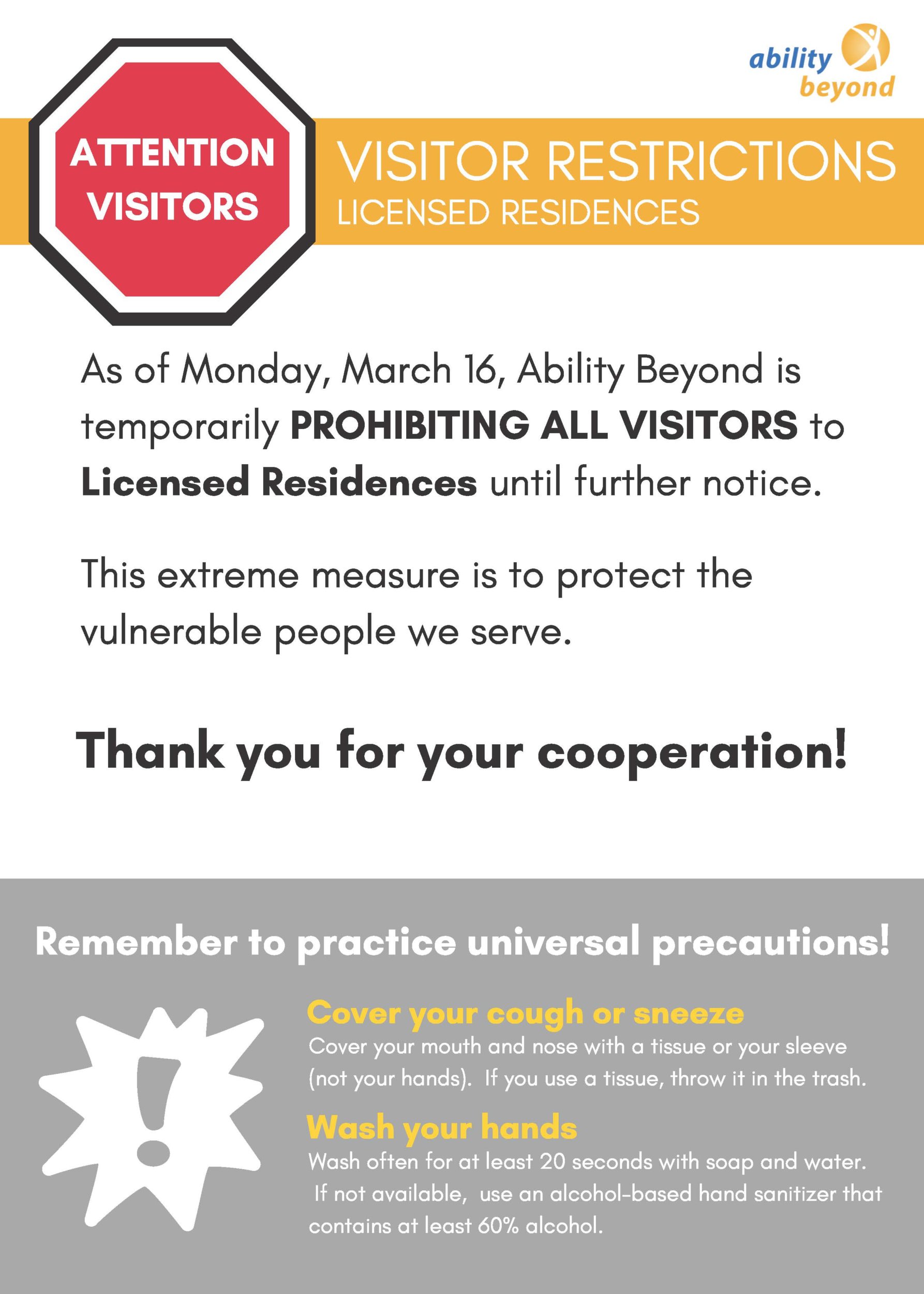 • At this time, Ability Beyond has NO COVID-19 cases and are following universal precautions to keep everyone as safe and healthy as possible.
